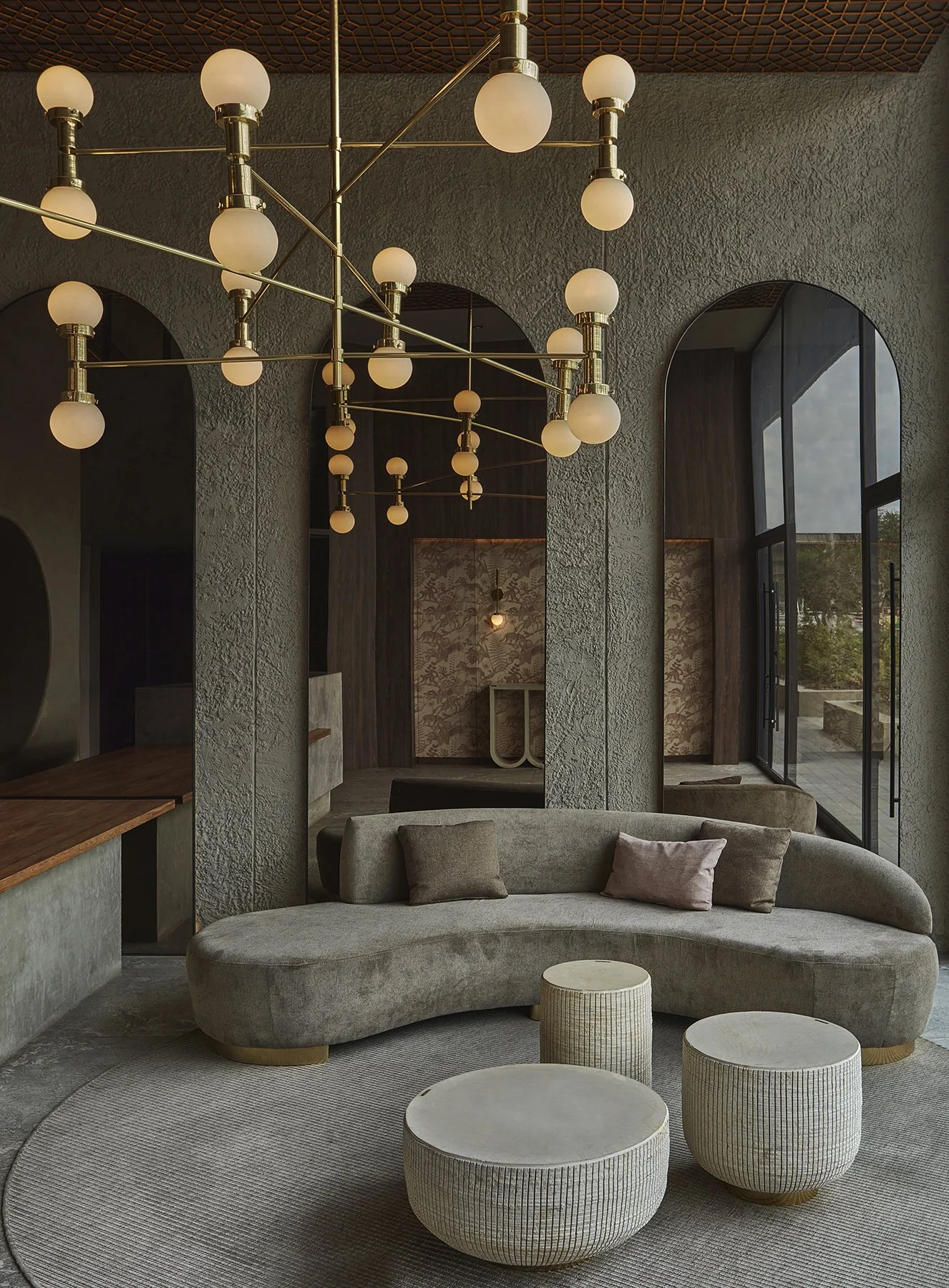 Other elements: the wall textures, coral stone tables, bronze mirrors and their reflections, and golden accents, create a high-impact setting. From the lobby, one can access the wellness-spa area, swimming pool, yoga and Pilates room, gym, and TRX area, where natural, calming tones dominate the material palette. In the spa, a tree trunk suspended on a pedestal sets the tone, while a cement lattice —an iconic element in the studio’s designs— allows light to pass through and connects the interior spaces with the outdoors.